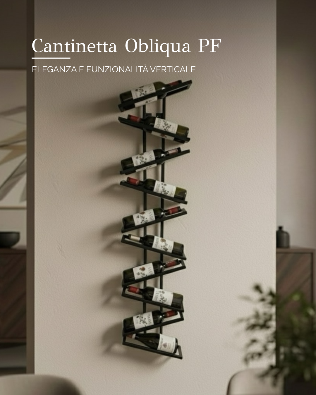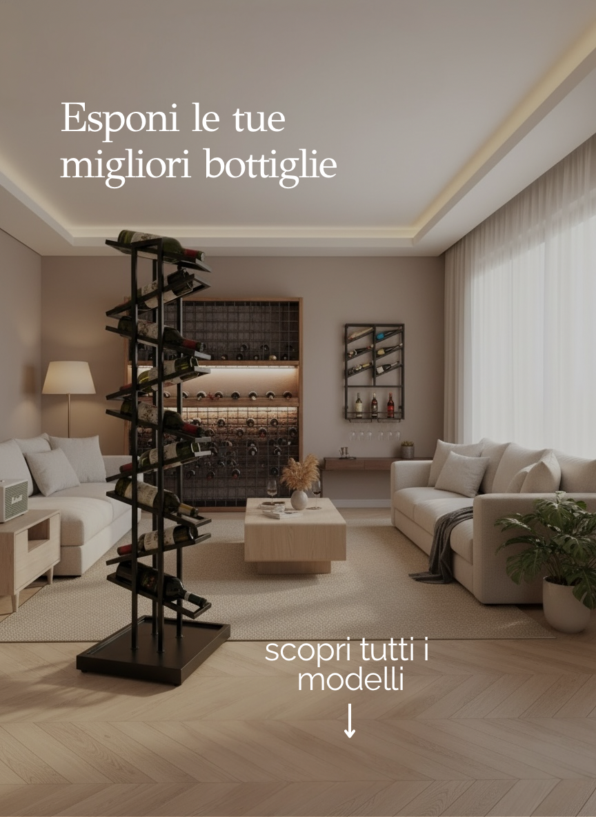 10 ripiani obliqui che permettono di esporre la bottiglia sia con il "collo" verso l'alto che verso il basso