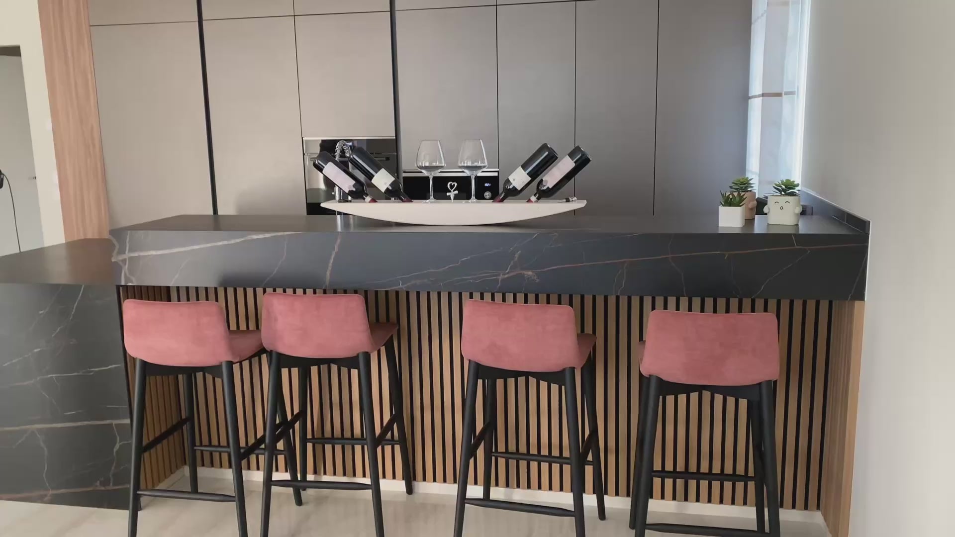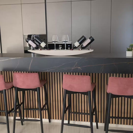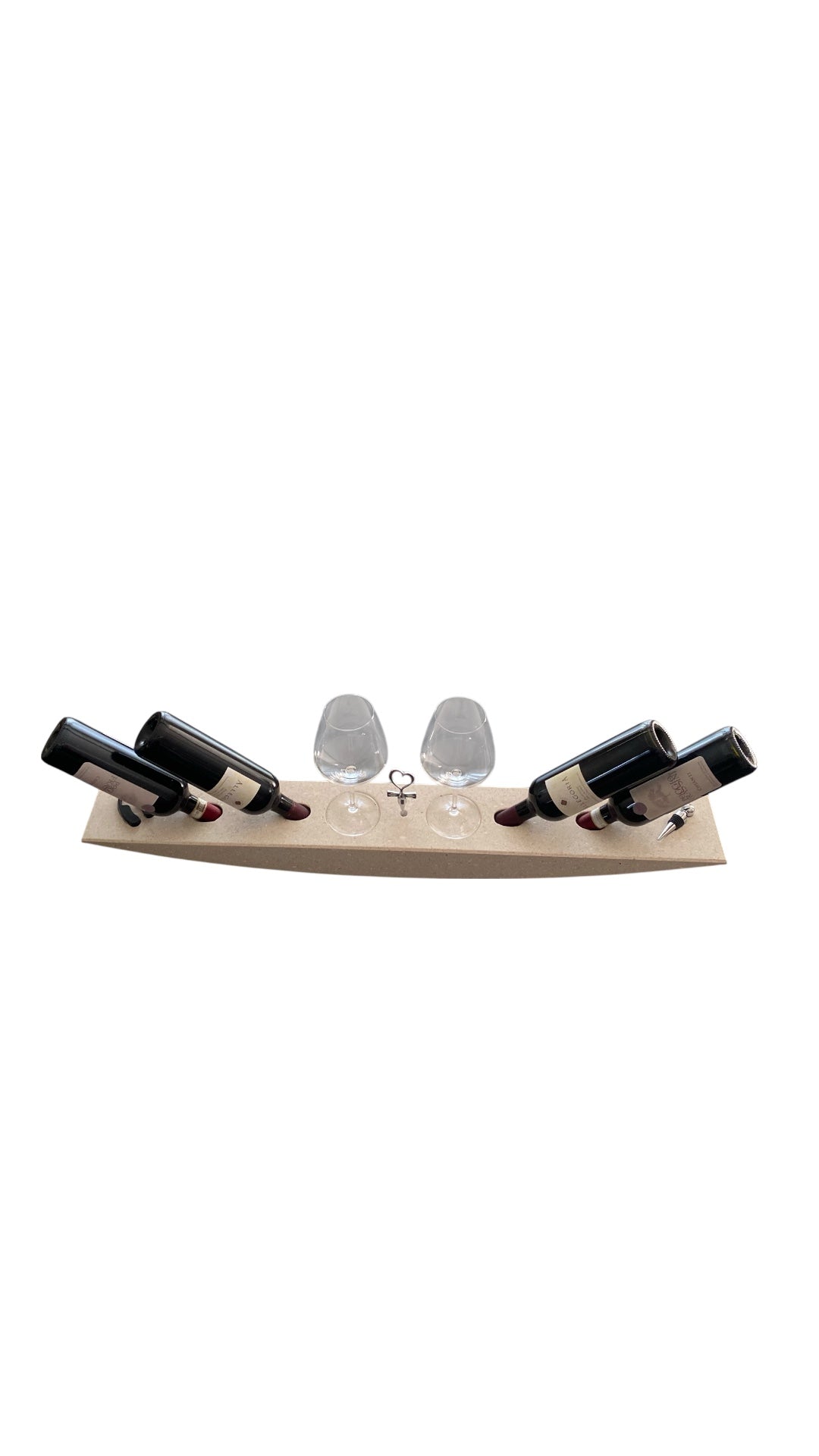 La parte superiore del portabottiglie è progettata con il massimo comfort in mente: include un’asola laterale per il taglia capsule, una centrale per il cavatappi e un’ulteriore asola a destra per il salvafreschezza. Inoltre, per completare l’esperienza di degustazione, il design prevede anche due asole al centro, perfette per ospitare due calici di vino, rendendo ogni brindisi ancora più elegante.